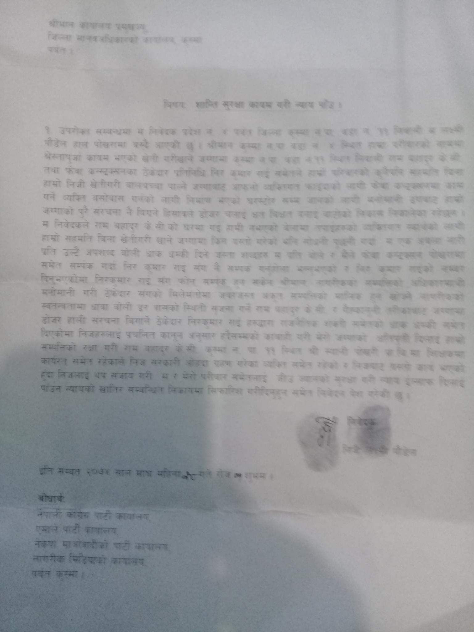 उनले कुश्मा नगरपालिका ११ बस्ने रामवहादुर के।सी र फेवा कन्स्ट्रक्सनका ठेकेदार निरकुमार राईले घरमा कोही नभएको मौका छोपेर आफ्नो जग्गामा डोजर लगाएर टहरोे वनाएको भन्दै पौडेलले न्यायको माग गरेकी हुन् । फेवा कन्ट्रक्सनका ठेकदार निरकुमार राई र स्यानीपोखरी प्राविका शिक्षक समेत रहेका रामवहादुर केसीले व्याक्तिगत जग्गामा कन्ट्रक्सनमा काम गर्ने कामदार वस्ने टहरो वनाएको र यसले जग्गा विग्रिएको उहाँले वताउनुभयो । आफुले खेतीपाती गर्ने जमिनमा केहि सहमती नलिई जग्गा हडप्ने काम भएको भन्दै पौडेलले जिल्ला प्रसासन कार्यालयको ध्यानकर्षण गराएकी छिन् । आफ्नो व्याक्तिगत जग्गा कव्जा किन गरेको भनेर सोधपुछ गर्दा उनलाई अपशव्द वोलेर धम्काएको जानकारी दिएकी छिन् ।