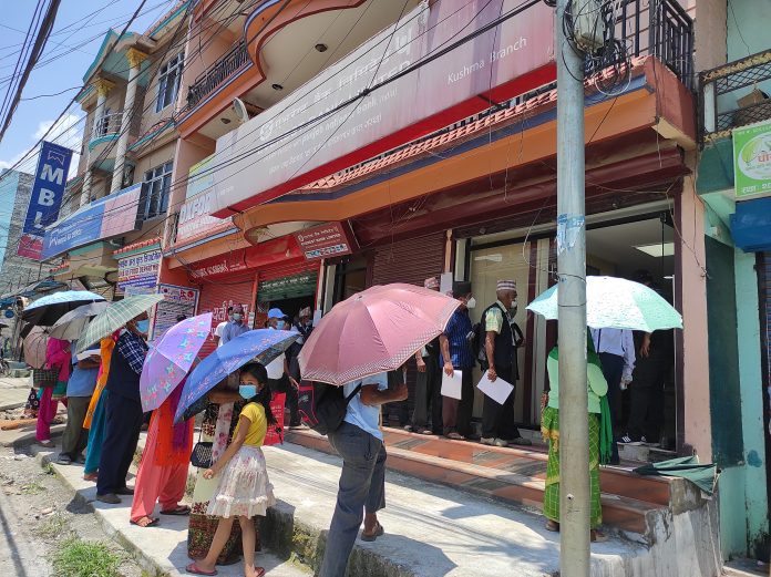 ‘कोरोना छ, गर्मी छ, गाडी चल्दैन, हिँडेरै यहाँसम्म आएको हुँ बाबु । घरमा पैसो सैसो छैन । ब्याङ्क खुलेको थाहा पाएसी अलिअलि भएको निकालेर खेताला मिलाम्ला भनेर आएको ।’ लाइनमा उभिएका कुश्मा नगरपालिकाका ज्येष्ठ नागरिक हरिप्रसाद शर्माले भने, ‘मास्क लगाएको छु, केही नहोला नि । बैङ्कमा नआई घर खर्ची चलेन ।’