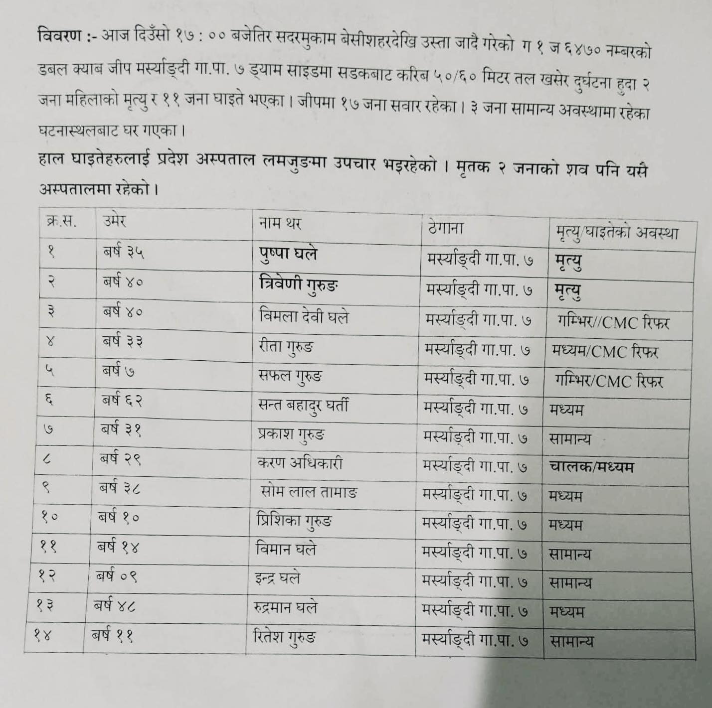 प्रारम्भिक जानकारी अनुसार मृत्यु हुनेमा मर्स्याङ्दी–७ का ४० वर्षीया गंगामाया (त्रिवेणी) गुरुङ र ३५ वर्षीया पुष्पा घले रहेका छन्।