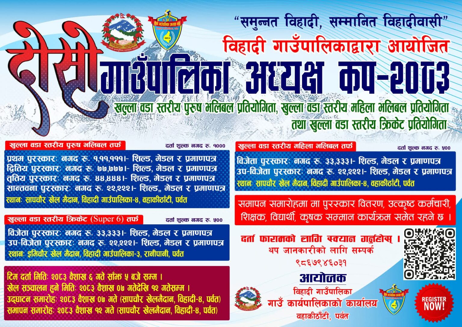 पर्वत। जिल्लाको विहादी गाउँपालिकामा दोस्रो अध्यक्ष कप प्रतियोगीताको आयोजना गरिएको छ । गाउँपालिकाले हिजो देखी गाउँपालिकामा दोस्रो अध्यक्ष कप प्रतियोगीताको आयोजना गरेको हो । वैशाख १२ गतेसम्म सञ्चालन हुने उक्त प्रतियोगीतामा खेलक्षेत्रका विभिन्न विधाका खेलहरु समावेश गरिएका छन् ।